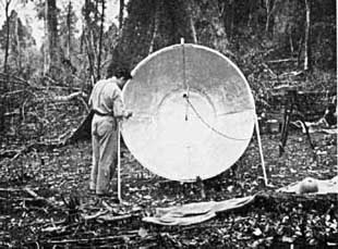 Parabolic reflectorsA parabola focuses incoming sound waves that are parallel to its axis onto a single point, the focus, where a microphone is placed. Whereas a shotgun microphone simply screens off sound from directions other than the sound source, a parabolic reflector can actually amplify the sound from the target direction. In addition, it also acts as a high pass filter especially for low frequency environmental sounds. Its effectiveness is determined by the diameter of the reflector in relation to the wavelength of the sound. Its gain and directivity increase proportionally with increasing the diameter/wavelength ratio. For wavelengths larger than the diameter of the parabola, the response is predominantly that of the microphone itself. As the wavelengths become smaller than the parabola's diameter, gain and directivity increase as the frequency increases. Common diameters are 45 cm, 60 cm and 90 cm with directionality starting respectively at about 750, 550 and 375 Hz. Only the larger dishes can be recommended for primate studies: they are able to cover the frequency range of calls produced by the smaller primate species, at least. Many larger species, however, produce calls which go well below 375 Hz. For a parabola to become effective at frequencies as low as 100 Hz, its diameter must be larger than 3 metres. It is obvious that the size of a parabolic reflector makes it difficult to follow primates through tropical forests with this equipment in hand, even if some plastic parabola (Telinga) can be rolled up for travelling. Parabola may be of better use in stationary recording sites or in more open forests and in open habitat. There are a variety of parabolas available made of metal, fibreglass or clear plastic. Microphones for use in parabolic reflectors typically cost anywhere from $300 to $1,500. Some providers such as Telinga and Saul Mineroff Electronics sell complete systems which include a parabolic reflector with a microphone and shock-mount system. If you have to work on a tight budget, you may consider building a parabolic reflector yourself. With a large bowl- or umbrella-shaped dish, you can add some directionality to any non-directional microphone. The microphone is positioned in the focal point of the reflector which, fortunately, is not very narrowly defined. In this area, the sound is concentrated and yields an increased sensitivity. Björn Merker (pers. comm.) built two parabolic reflectors out of bowl-shaped plastic flower pots, and equipped each with a cheap non-directional microphone and a wire handle. This construction appeared to work well, and, as an advantage, enabled him to make stereo-recordings. When travelling, the plastic bowls could be placed into each other and used to contain cables and protect the microphones or the tape-recorder. When recording, the two microphones were individually directed at one or two of the calling animals.