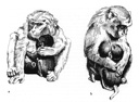 June 1985. Siamang (Symphalangus syndactylus). Pencil sketches, partially inked. | 1987. Crab-eating macaque (Macaca fascicularis), female with her twin offspring. Ink drawing. Published in: Geissmann, T., 1989: Multiple births in catarrhine monkeys and apes - A review. Il Sedicesimo, Firenze. 78 pp. ISBN 88-85342-02-7 | |