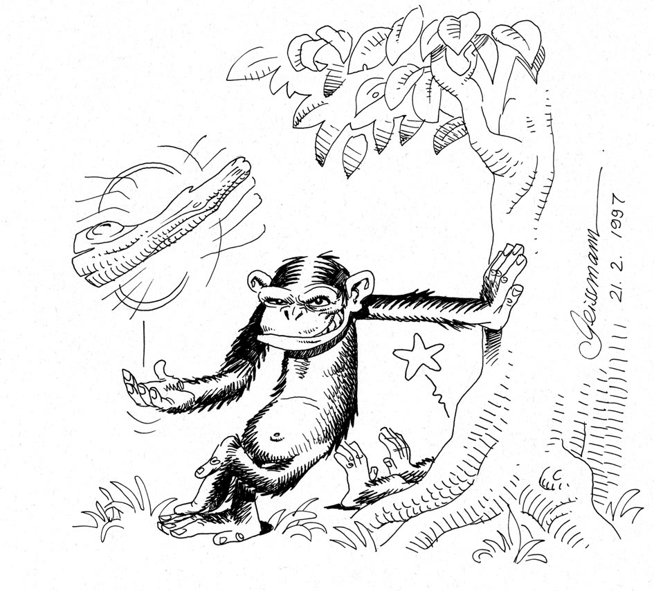 | July 1993. "Dumbo's last day". Ink drawing. | October 1995. Comisson drawing for the Anthropological Museum of Zürich University, illustrating how hands and feet of primates are adapted to safely holding on to tree branches. Ink drawing. | December 1996. "A mouse lemur! Hey, I see a mouse lemur!" Ink drawing. | February 1997. "Chimpanzee tool use". Ink drawing. | February 1998. "Gino the Hyeno". Ink drawing. |